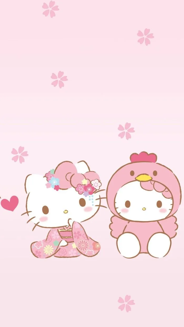 Tampilan gambar dua Hello Kitty warna pink, satu mengenakan kimono dan satunya mengenakan baju ayam, dapat memberikan kesan yang lucu, cantik, dan menggemaskan. Dua karakter Hello Kitty dengan pakaian yang berbeda menambahkan variasi pada tampilan wallpaper, dan latar belakang warna pink dan hiasan lain seperti bunga atau love-love dapat memperindah tampilannya. Selain itu, perbedaan pakaian antara kedua karakter tersebut dapat memberikan kesan yang menarik dan menyenangkan bagi pengguna hp.