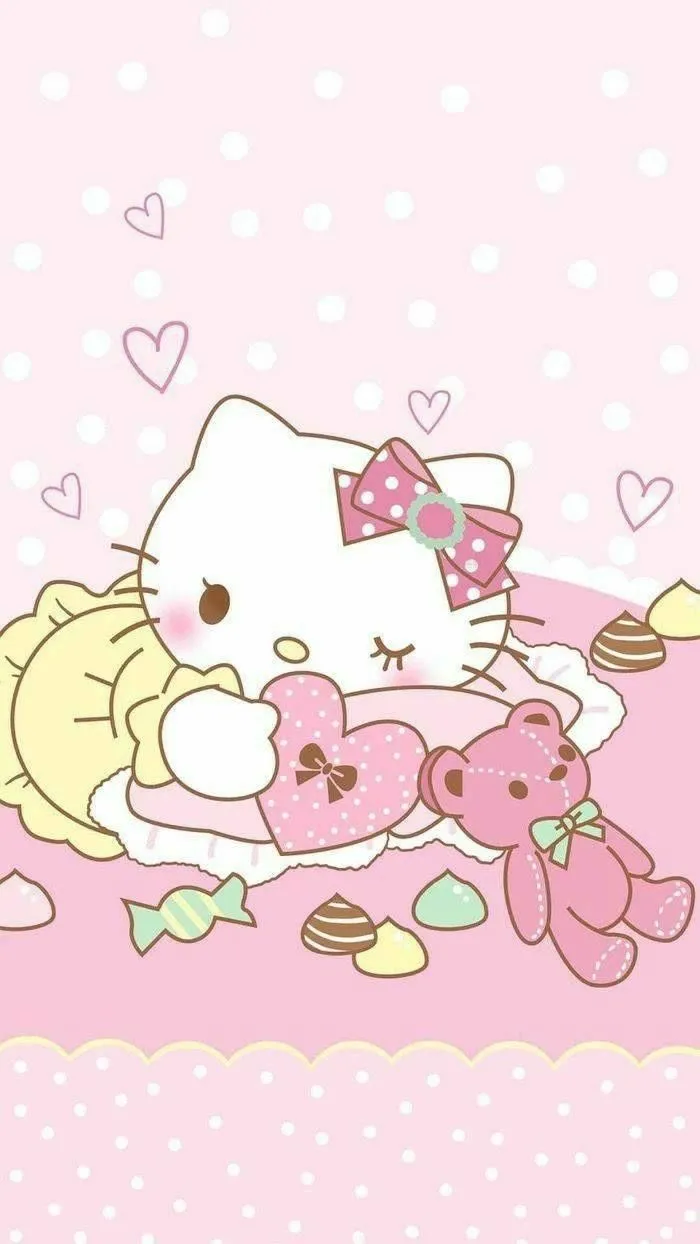 Gambar Hello Kitty yang sedang tidur dengan boneka kesayangannya dan hiasan lainnya memberikan kesan yang sangat menggemaskan dan menenangkan sebagai walpaper hp. Dengan warna kuning yang cerah pada gaunnya dan latar belakang yang hangat, gambar ini cocok untuk digunakan sebagai walpaper untuk menghadirkan suasana keceriaan dan kenyamanan pada layar ponsel Anda.